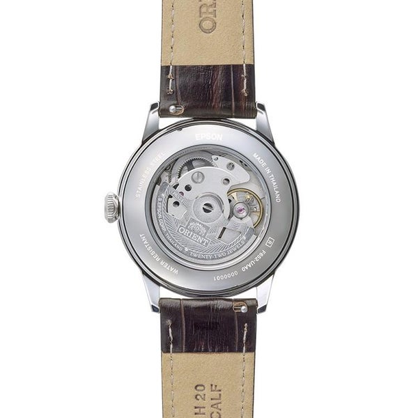 現代のライフスタイルにマッチした腕馴染みの良い直径38.4mmケースの『オリエントバンビーノ 38』は、機械式時計のクラシカルな味わいと、ほどよいトレンド感が絶妙に調和する各モデルは愛好家の普段使いに最適です。時刻表示のみのミニマムデザインに受け継がれているのは、ローマ数字とバーインデックスが交互に並ぶ人気の「とびローマ」。工具不要で交換が容易に可能なイージーエクスチェンジストラップ方式のレザーストラップが付属します。自身で時計のイメージを変えることができるストラップ交換は、時計を着けて楽しむ機会を増やすだけでなく、個性的なファッションの演出にも効果的です。