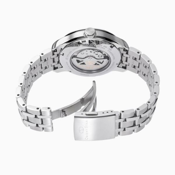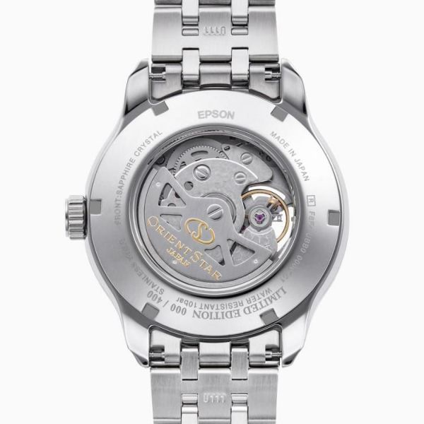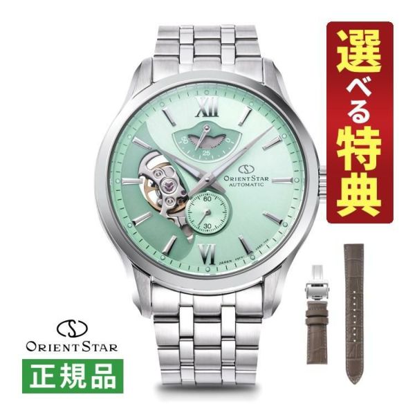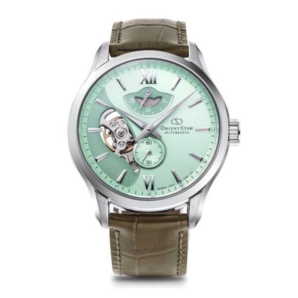 青い海を吹き渡る爽やかな風のようなミントグリーン文字板に、高品質ステンレススチール(SUS316L)を使ったピッチの細かい5列のメタルバンドを組み合わせ、アクティブで若々しいイメージを演出します。また、カーフレザーバンドも付属し、時計の表情を変えて楽しむこともできます。搭載する自動巻きムーブメントは、50時間以上のパワーリザーブと、日差プラス25秒からマイナス15秒の安定した高精度を実現する自社製キャリバーF6F44。オリエントスターの特長であるパワーリザーブ表示を装備した高品質のメカニズムが、新しい文字板カラーによってスタイリッシュな趣を増した『レイヤードスケルトン』で時を刻み続けます。また、ムーブメントを見せるシースルーの裏ぶたに数量限定シリアル番号の刻印を記し、特別感を高めています。