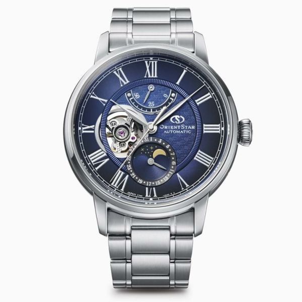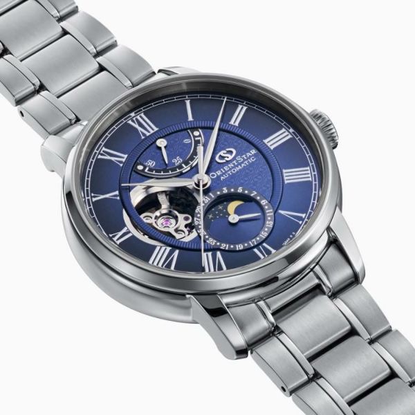 外周にクラシカルなローマ数字を配し、文字板リング内側の中央部に光の加減で浮かび上がるOSマークをあしらうなど、初代「メカニカルムーンフェイズ」に最も近いデザインに回帰しながらも、本シリーズの心臓部となる「月齢機構」の表現を刷新。月の背景は瑞々しい深いブルーの夜空に、星は明度の向上によってシャープな印象になりました。両球面サファイアクリスタルに施されたSARコーティング(両面無反射)が光の反射を約99%防ぎ、どの角度から見ても高い視認性で文字板の隅々まで見渡すことができます。