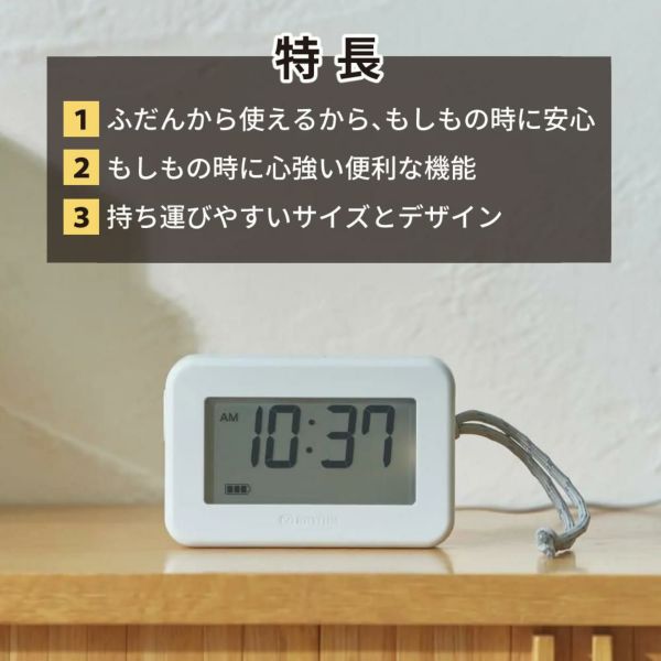 バックライト常時点灯表示で昼夜を問わず時刻が見やすい充電式デジタル時計です。