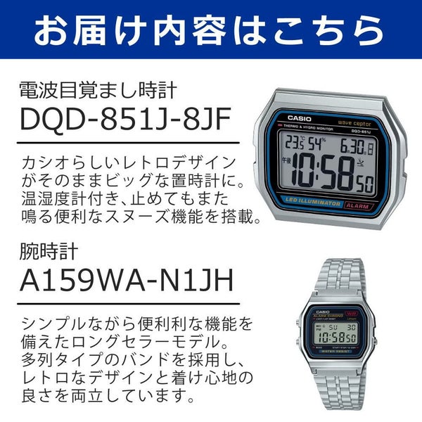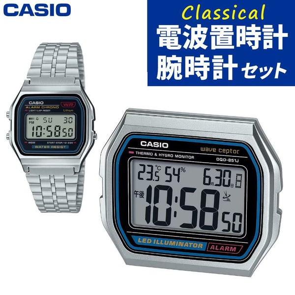 カシオらしい、クラシカルなデザインの電波置時計と腕時計をセットにしました。