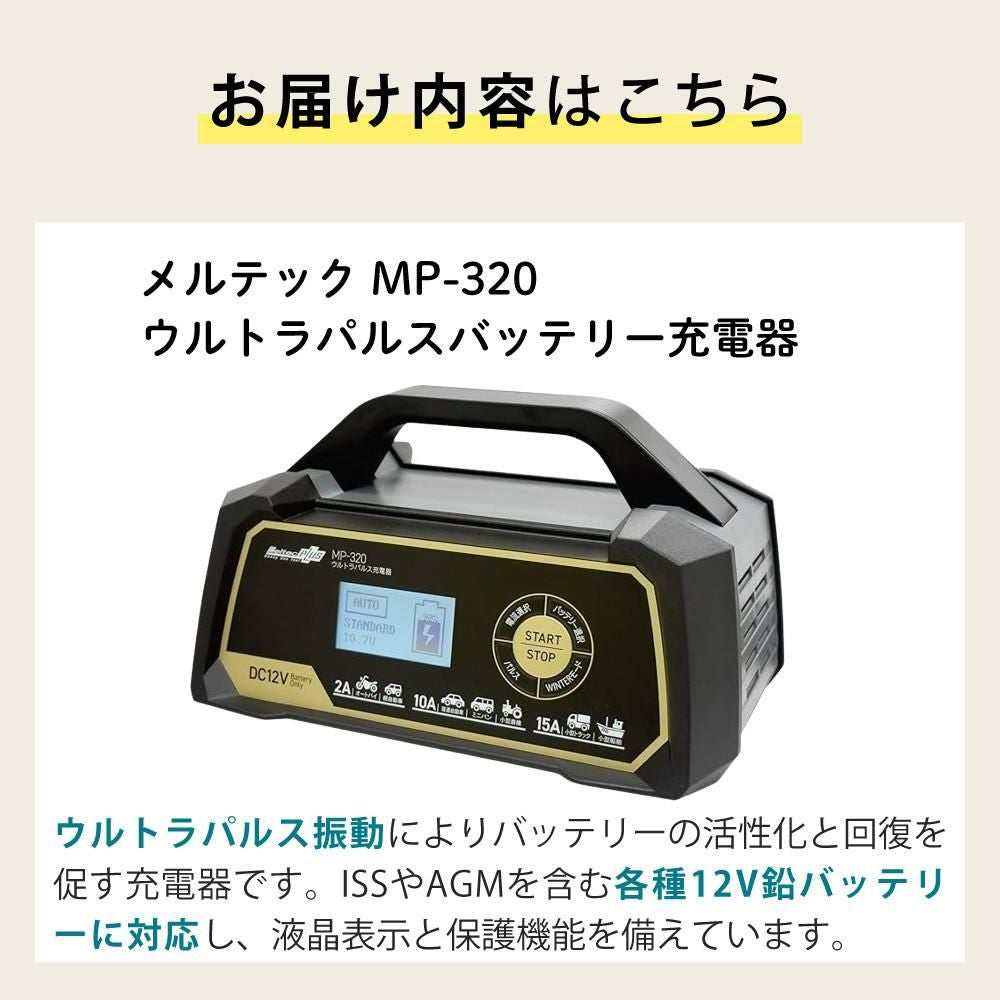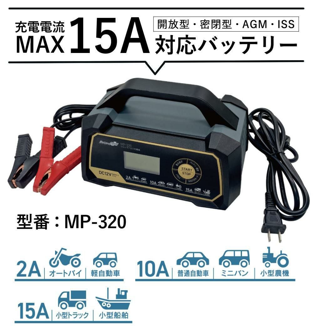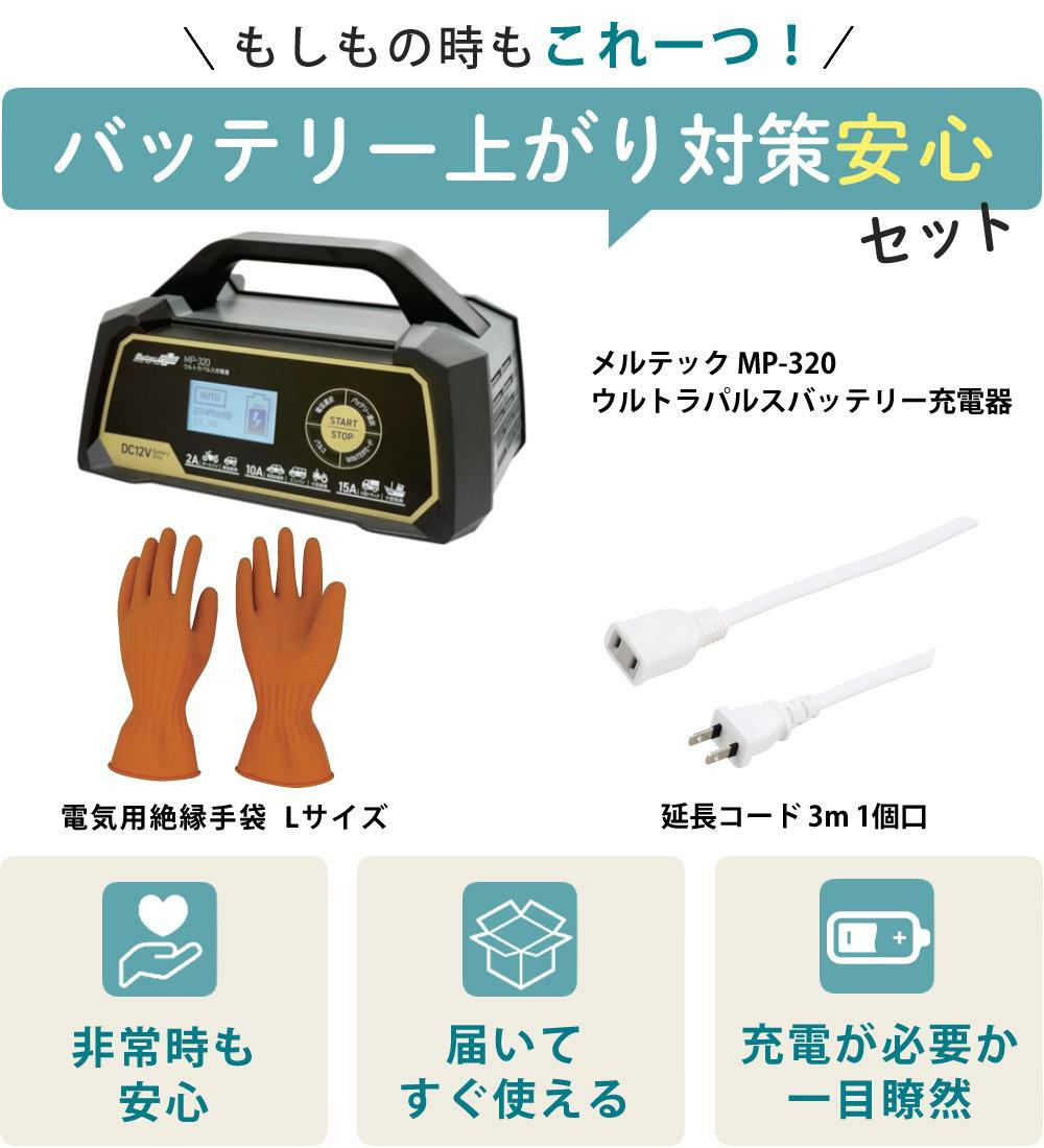 他の画像を見る バッテリー充電器 充電機 全自動 オートバイ バイク 軽自動車 普通車 自動車 ミニバン 小型農機 アイドリング車 対応 開放型 密閉型 (バッテリー充電器セット)メルテック MP-320 ウルトラパルスバッテリー充電器&絶縁手袋&延長コード(ラッピング不可) 販売価格 ¥ 13,400 税込 カートに入れる お気に入りに登録する (0件)