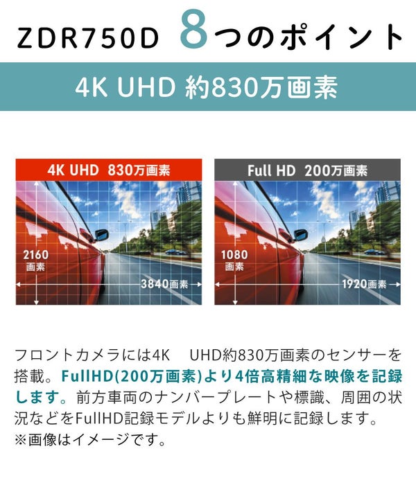 | 録画サイズ | フロント: 4K 3840×2160 WQHD 2560×1440 FullHD 1920×1080 リヤ:FullHD 1920×1080 |