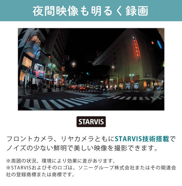 | 夜間・暗所撮影対応センサー | フロント: STARVIS?技術搭載 リヤ:STARVIS?技術搭載 |