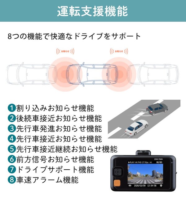 | 割り込み お知らせ機能 | ○ 自車前方への割り込み車両を検出しお知らせします ※録画サイズ【F:4K/R:FHD】設定時は使用不可 |