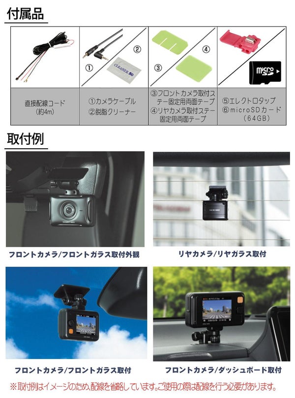 【付属品】直接配線コード(約4m/1Aヒューズ内蔵)、カメラケーブル(約9m)、フロントカメラ取付ステー固定用両面テープ、リヤカメラ取付ステー固定用両面テープ、脱脂クリーナー、エレクトロタップ、microSDカード(64GB/Class10)