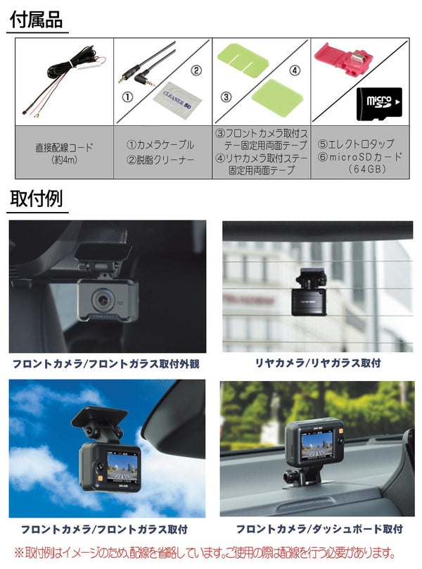 【付属品】直接配線コード(約4m/1Aヒューズ内蔵)、カメラケーブル(約9m)、フロントカメラ取付ステー固定用両面テープ、リヤカメラ取付ステー固定用両面テープ、脱脂クリーナー、エレクトロタップ、microSDカード(64GB/Class10) |