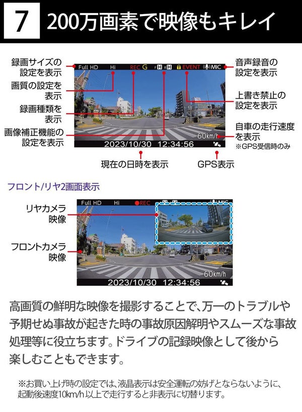 また衝撃を検出し、衝撃前/衝撃後の映像を記録します。