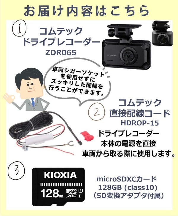 ドライブレコーダー ZDR065と、通常オプション品の直接配線コード HDROP-15がセットになっています。付属品のmicroSDカードより大容量の128GBのmicroSDカードもセットになってお得!