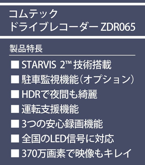 コムテック の ドライブレコーダー ZDR065 は、 前後2カメラ で 高画質 な フルHD 撮影に対応。 夜間撮影 もクリアで、 LED信号対応 や ノイズ対策 も万全。 GPS搭載 で 事故記録 も安心です。 駐車監視 や 衝撃検知 で、 走行中 も 駐車中 も しっかり記録。 2.4インチ液晶 で映像確認も簡単です。 32GB SDカード付属 で すぐに使えます。