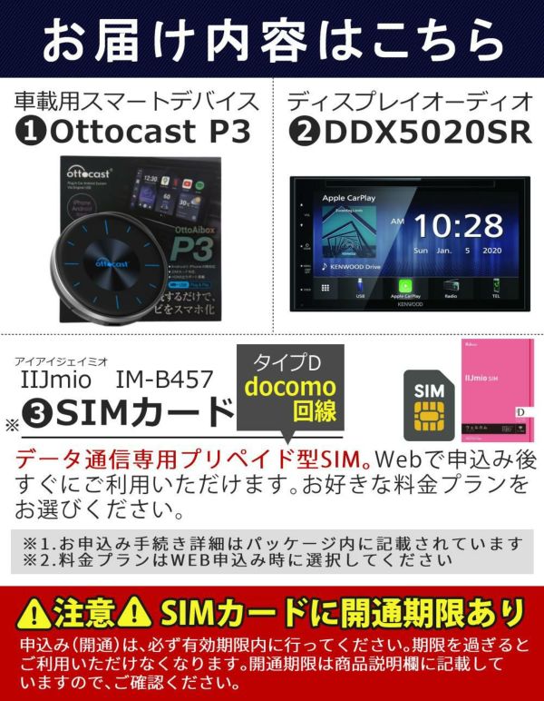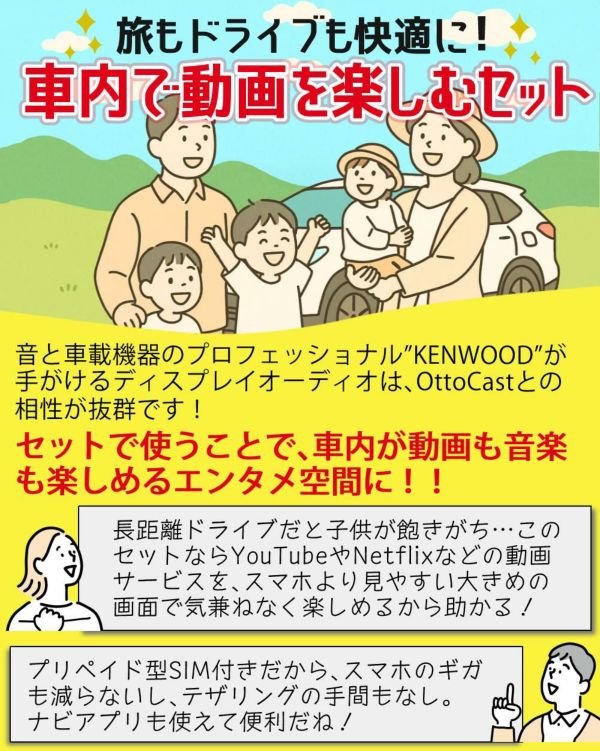 KENWOOD の DDX5020SR と OTTOCAST P3 は 相性抜群。 ナビアプリ や 音楽再生、 YouTube、Netflix などの 動画アプリ を 大画面 で楽しめる! プリペイド型 の SIM 付きだから テザリング不要、 スマホのギガ節約 にも。 長距離ドライブ(アウトドア キャンプ レジャー 渋滞対策 子供 家族 ファミリードライブ 車中泊 旅行)に最適な3点セットです。