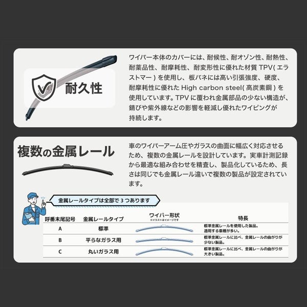 車のワイパーアーム圧やガラスの曲面に幅広く対応させるため、複数の金属レールを設計しています。実車計測記録から最適な組み合わせを精査し、製品化しているため、長さは同じでも金属レール違いで複数の製品が設定されています。