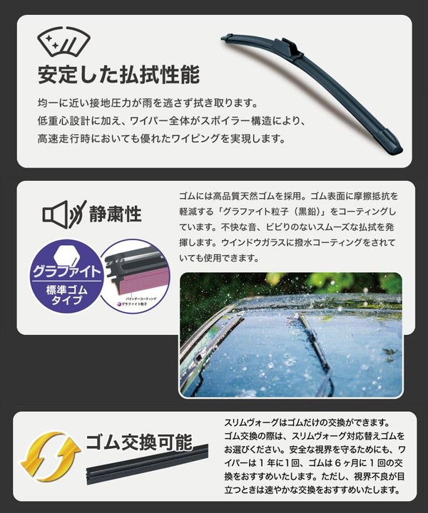 スリムヴォーグはゴムだけの交換ができます。ゴム交換の際は、スリムヴォーグ対応替えゴムをお選びください。安全な視界を守るためにも、ワイパーは1年に1回、ゴムは6ヶ月に1回の交換をおすすめいたします。ただし、視界不良が目立つときは速やかな交換をおすすめいたします。