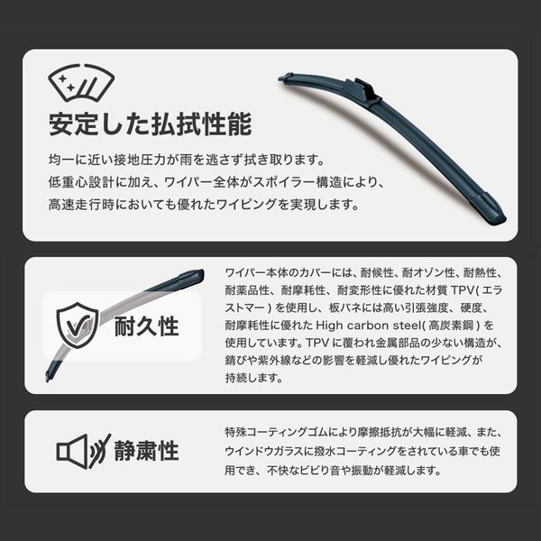 ワイパー本体のカバーには、耐候性、耐オゾン性、耐熱性、耐薬品性、耐摩耗性、耐変形性に優れた材質TPV(エラストマー)を使用し、板バネには高い引張強度、硬度、耐摩耗性に優れたHigh carbon steel(高炭素鋼)を使用しています。TPVに覆われ金属部品の少ない構造が、錆びや紫外線などの影響を軽減し優れたワイピングが持続します。