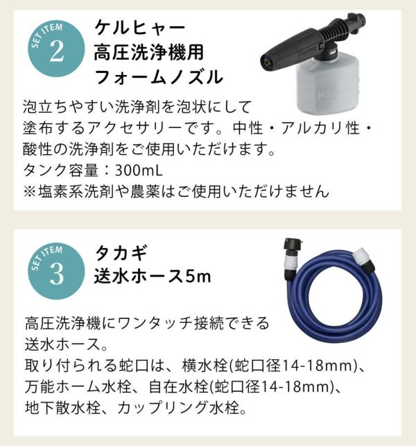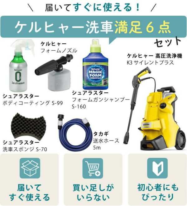ケルヒャー高圧洗浄機「K3 サイレント(60Hz)」に、フォームノズル、送水ホース、ボディコーティング、フォームガンシャンプー、洗車スポンジのセットです。これ1セットで洗車が完結します。