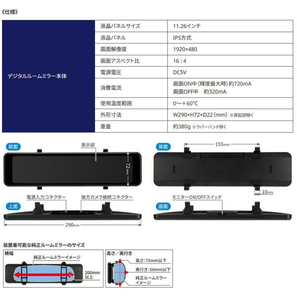 デジタルルームミラーDRM6030は、フルハイビジョン(1920×1080)の後方カメラが捉えた映像を11V型のワイドモニターに高精細表示するルームミラー型モニターです。