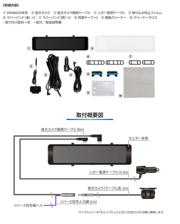 【付属品】DRM6030本体、後方カメラ、後方カメラ接続ケーブル、シガー電源ケーブル、映り込み防止フィルム、ラバーバンド(長) ×2、ラバーバンド(短) ×2、両面テープ ×2、脱脂クリーナー、クリーナークロス、取り付け部材一式、取付/取扱説明書 |