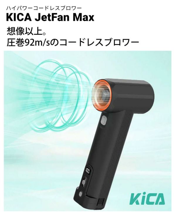 KiCAブランド「Jet Fan Max」は、圧倒的な風速92m/sを誇るハイパワーコードレスブロワーです。