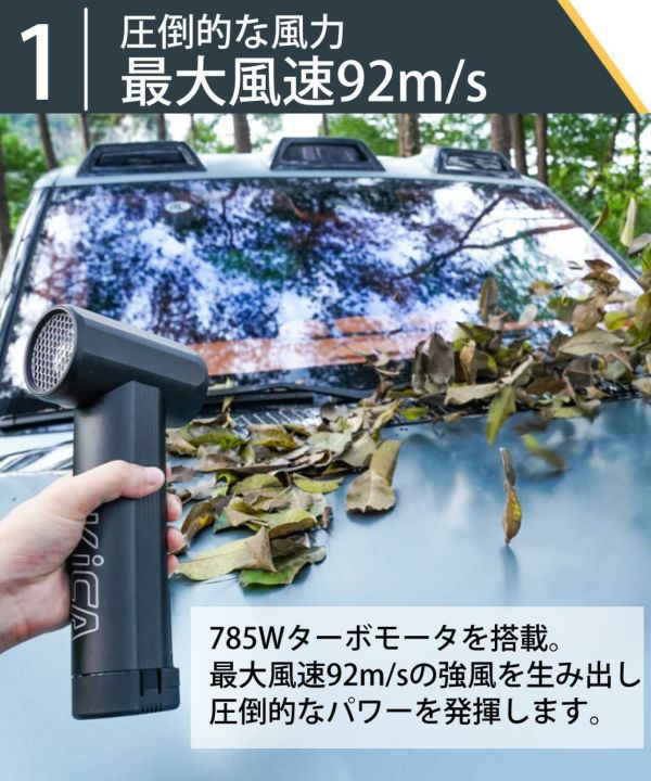 785Wターボモーターを搭載。最大風速92m/sの強風を生み出し、車の水切りや落ち葉の吹き飛ばしにも使える圧倒的なパワーを発揮します。