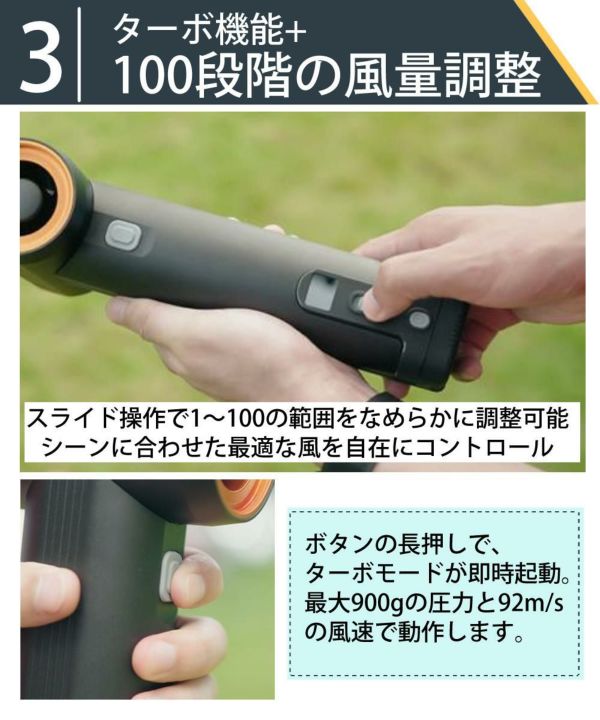 ターボ機能を効果的にご活用いただくには、通常はレベル100でご使用いただき、風力がさらに必要な場面でピンポイントにターボボタンを押してご使用いただくことをおすすめします。