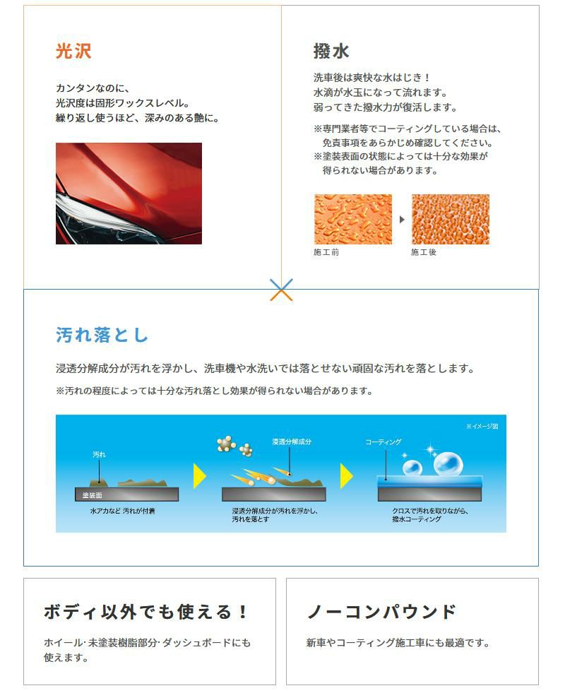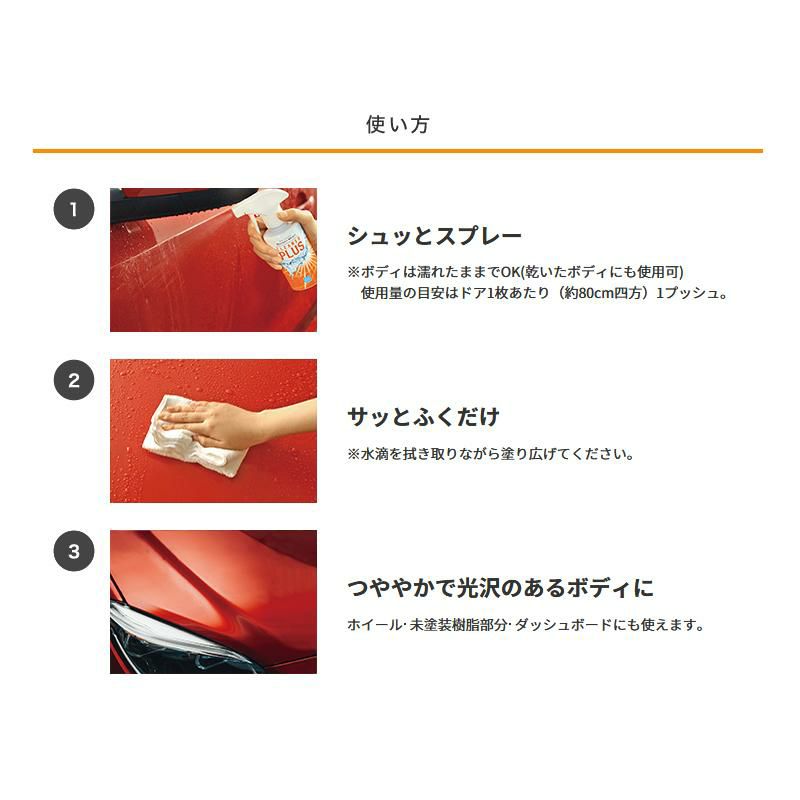 ●頑固な水アカ汚れを拭き上げと同時に簡単洗浄! スマートミストに洗浄効果をプラスしました。 洗車後のボディにスプレーして拭くだけ。 これ1本で、洗浄・ツヤ出し・撥水!