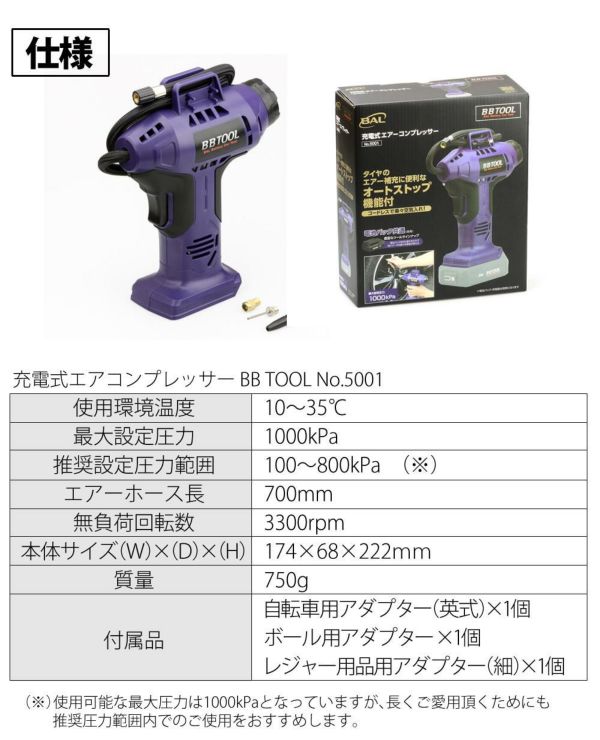 大橋産業 BAL 充電式エアコンプレッサー BB TOOL No.5001は、ポータブル でコンパクトな エアコンプレッサー。もち運びにも便利。車両の タイヤ交換 の際や家庭用の インフレータブル製品 にも 空気補充が簡単にできます。コードレスで使いやすい仕様です。