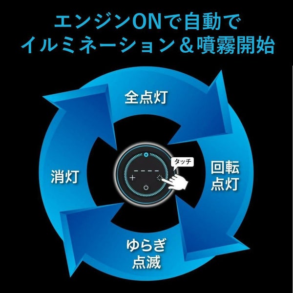 前回の設定モードを記憶して、エンジン(ACC)ON時に、自動で噴霧とイルミネーションを開始*。面倒な毎回の電源ONが不要です。