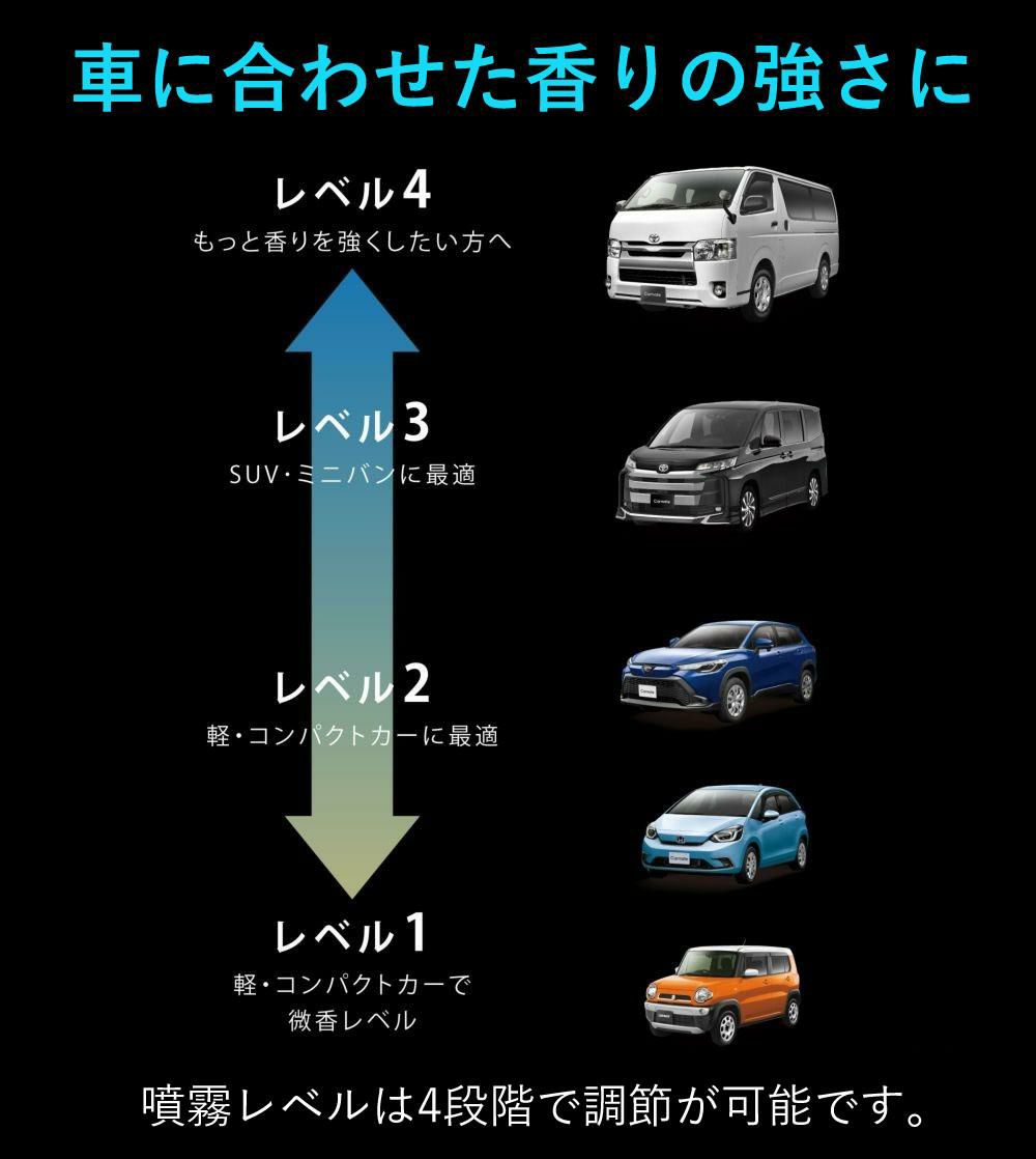 ・レベル4(モンスター級):ミニバンなど 大型車の大きな空間のクルマは勿論のこと、強めの香りが好みの方にもおすすめです。持続期間は約20日*。