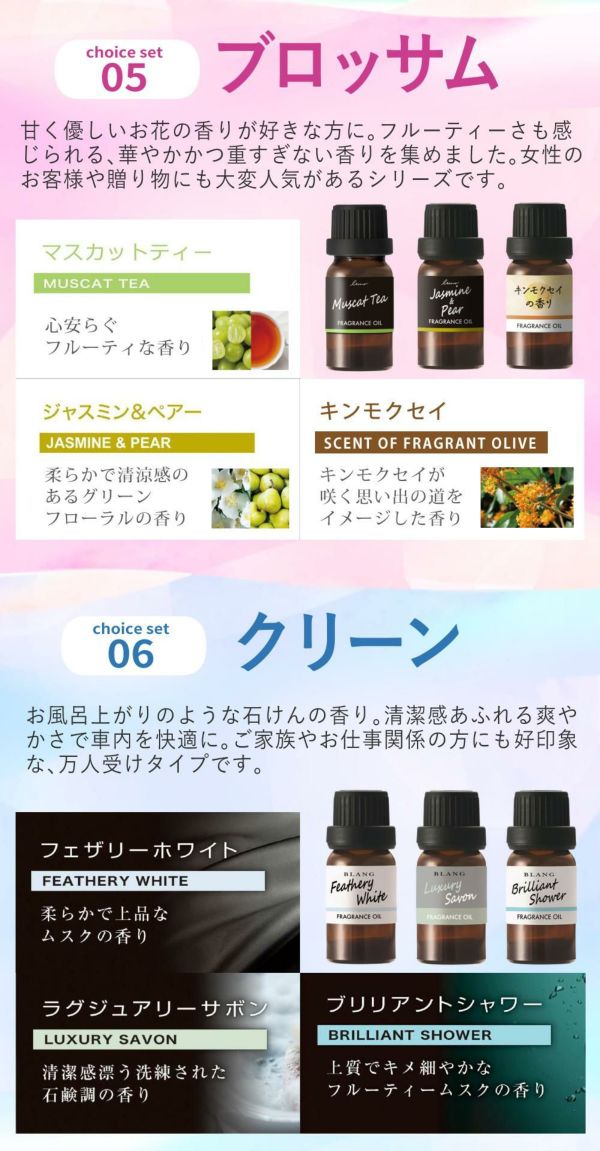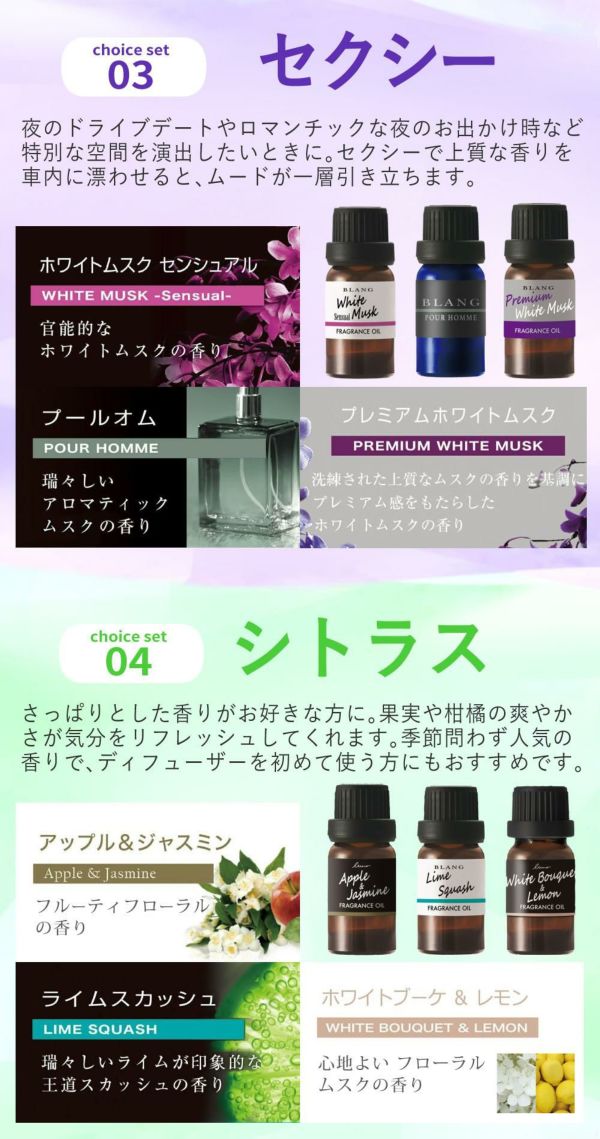 さらに、 シトラス は 初めて の方にも人気、 ブロッサム は 贈り物 に、 クリーン 万人受け の 清潔感 、 エレガンス は 高級感 と 大人 の雰囲気を演出します。