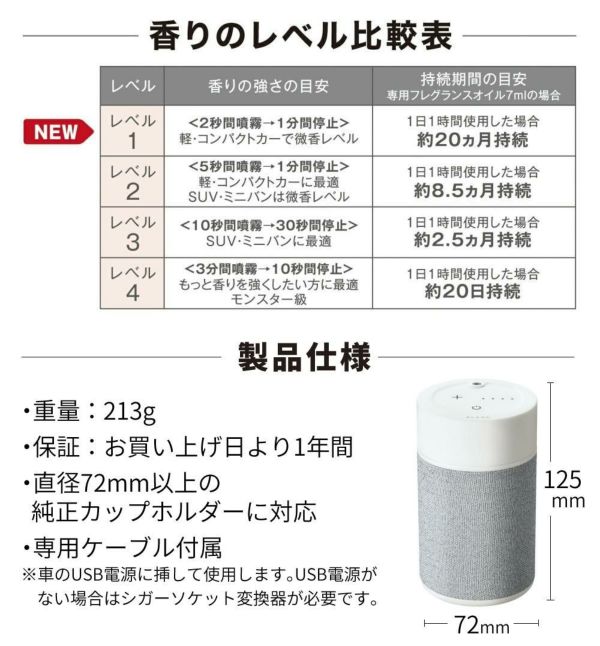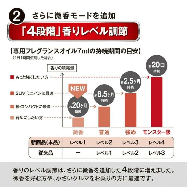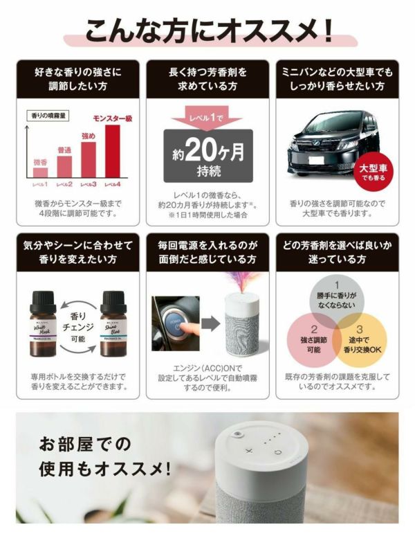 ・レベル4(モンスター級)ミニバンなどの大きな空間のクルマは勿論のこと、もっと香りを強くしたい方に最適です。
