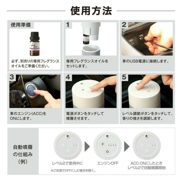 レベル4で使用すれば、芳香剤を何個も使わないと香りが楽しめなかったミニバンなどの大型車もこれ一台で充分に香りをいきわたらせることができます。