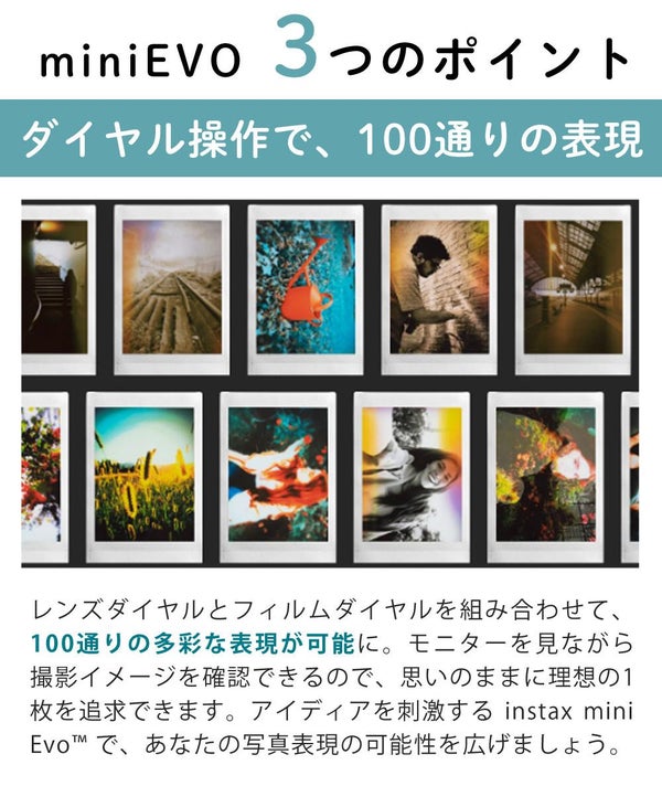 instax史上最高画質(2021年12月時点)を実現。レンズエフェクト10種、フィルムエフェクト10種を搭載し、組み合わせは最大100通り。instax mini Evoならチェキフィルムでも豊かな表現が可能です。