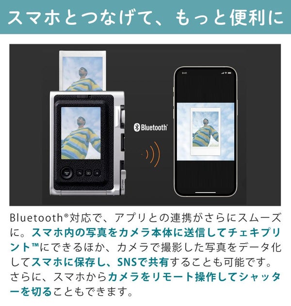 富士フイルムのハイブリッドインスタントカメラ「チェキ instax mini Evo」は、デジタル撮影とアナログプリントを融合した新世代のチェキです。スマホと連携し、撮ったその場でinstax miniフィルムにプリントできます。