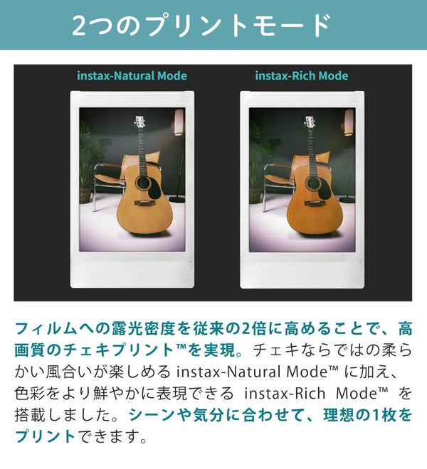 instax史上最高画質(2021年12月時点)を実現。レンズエフェクト10種、フィルムエフェクト10種を搭載し、組み合わせは最大100通り。instax mini Evoならチェキフィルムでも豊かな表現が可能です。