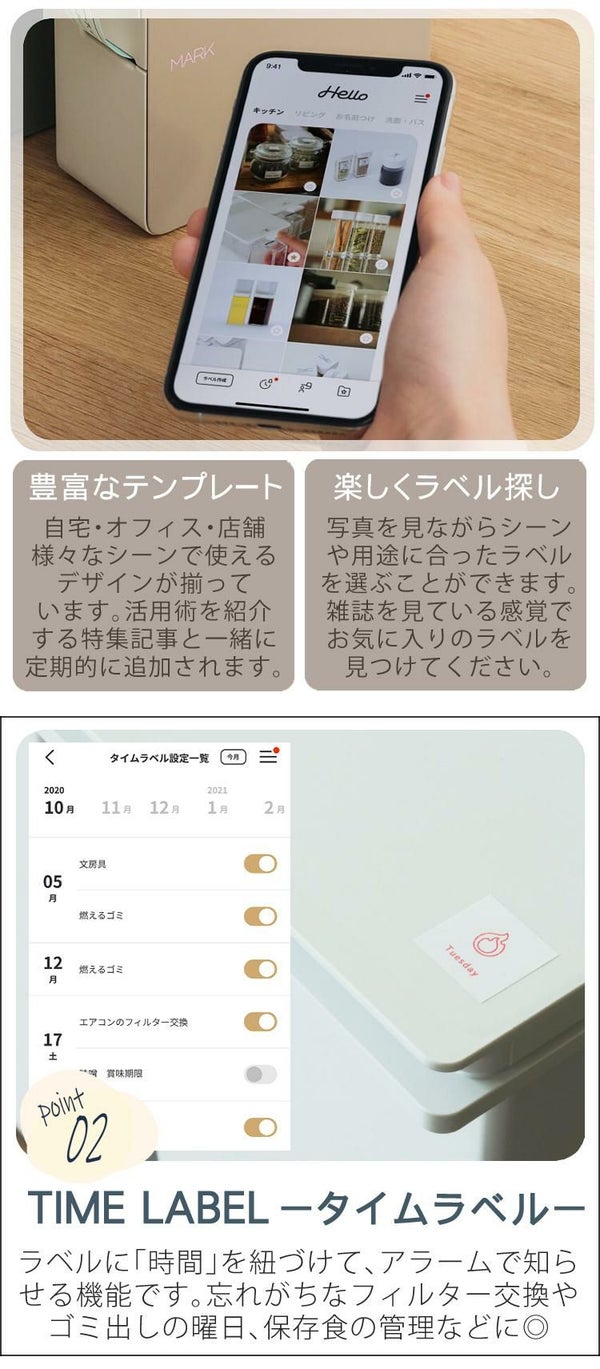 テプラプロ " マーク (MARK) "は、iOS/Android の専用アプリ「Hello」とBluetooth(R)で接続してラベルを作成するスマートフォン専用の「テプラ」です。