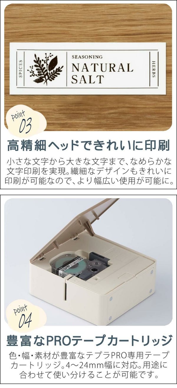 最大24mm幅のテープカートリッジが使用でき、「テプラ」最上位機種同等の高精細ヘッド(360dpi)で、繊細なデザインもきれいに印刷できます。