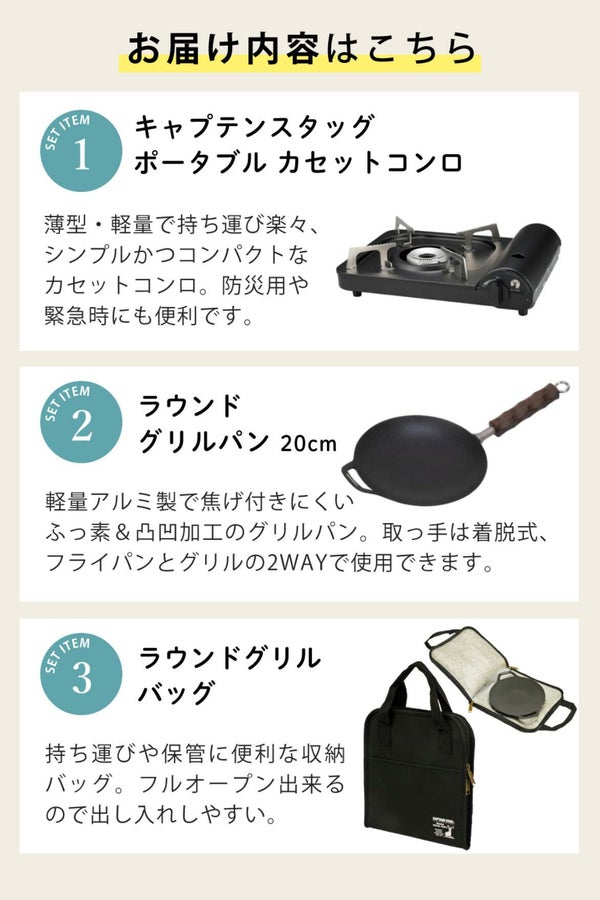 | 仕様/その他 | 火力/3.5kW(3000kcal/h)※1 ガス消費量(約)/250g/h ※1 点火方式/圧電点火方式 安全装置/圧力感知安全装置 使用ガス/プロパンガス 使用容器/M-7621キャップテンスタッグガスボンベ3本パック(1本250g) 使用時間/250g:約60分(容器1本) 本商品にはカセットボンベは含まれておりません。 ※1 使用周囲温度20~25℃ガス消費量・使用時間は、表示火力にとづく理論値です。実際とは異なる場合があります。 |