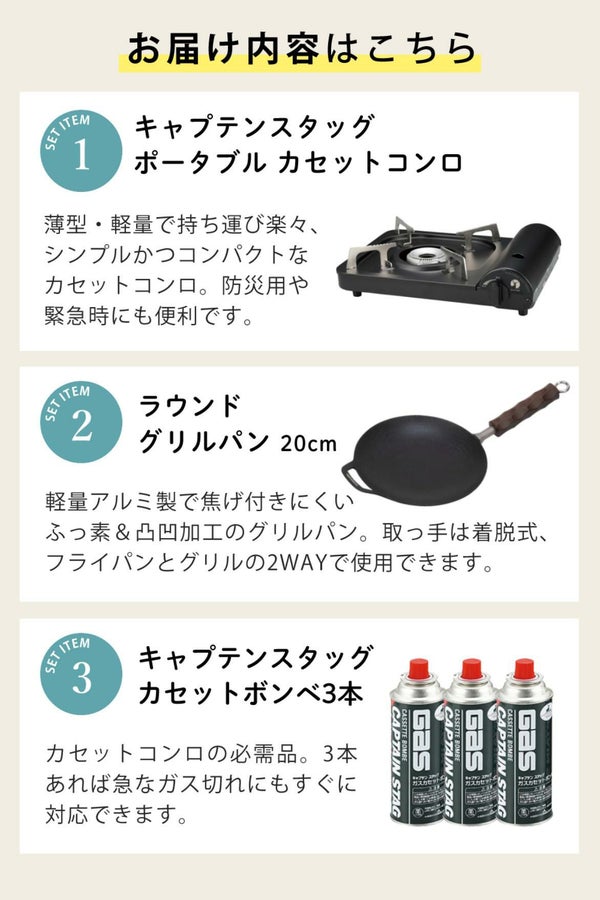 | 仕様/その他 | 火力/3.5kW(3000kcal/h)※1 ガス消費量(約)/250g/h ※1 点火方式/圧電点火方式 安全装置/圧力感知安全装置 使用ガス/プロパンガス 使用容器/M-7621キャップテンスタッグガスボンベ3本パック(1本250g) 使用時間/250g:約60分(容器1本) ※1 使用周囲温度20~25℃ガス消費量・使用時間は、表示火力にとづく理論値です。実際とは異なる場合があります。 |