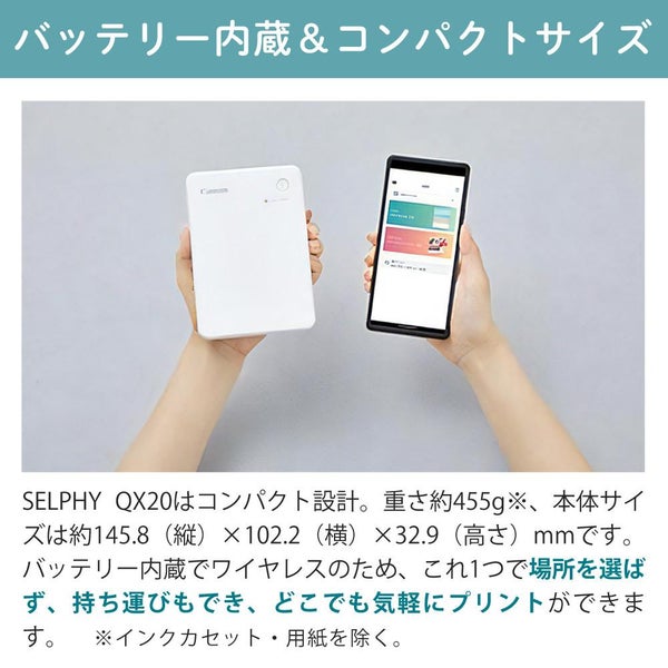 ●SELPHY QX20はコンパクト設計。重さ約455g※、本体サイズは約145.8(縦)×102.2(横)×32.9(高さ)mmです。バッテリー内蔵でワイヤレスのため、これ1つで場所を選ばず、持ち運びもでき、どこでも気軽にプリントができます。
