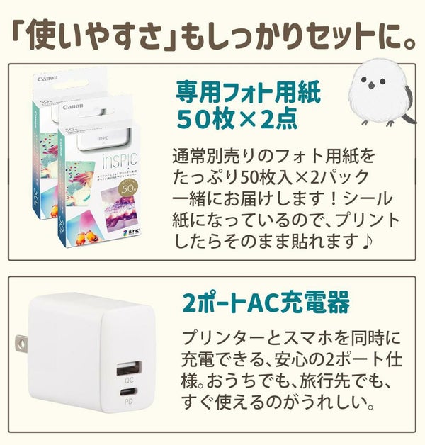 【付属品】充電用USBケーブル(Type-A to Type-C)、キヤノン用ZINKフォトペーパーパック(10枚入り)、クイックガイド、保証書 |