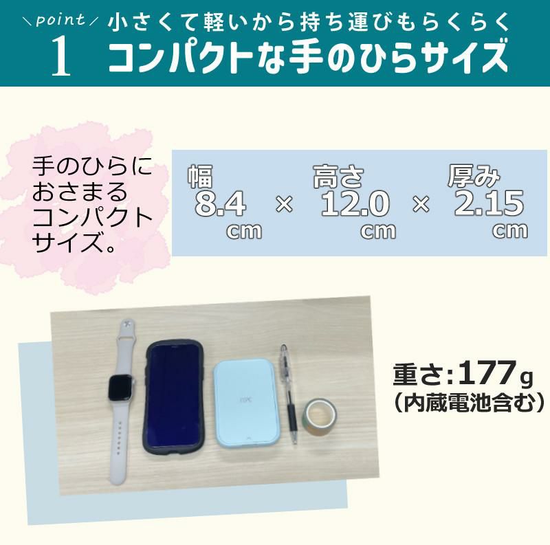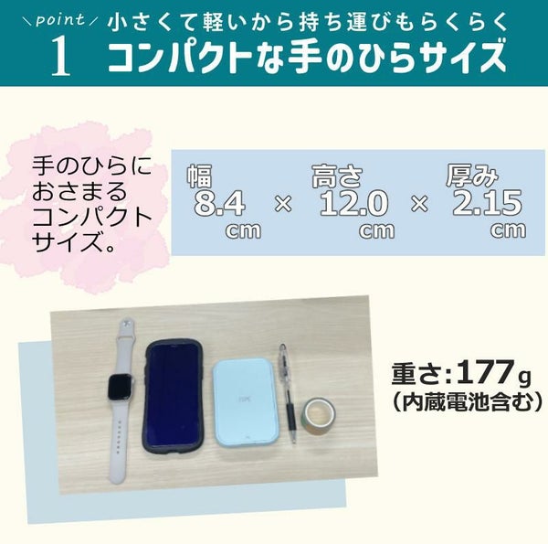 重さわずか177グラム、大きさ120mm(縦)×84mm(横)×21.5mm(高さ)、持ち運びもラクラクです。