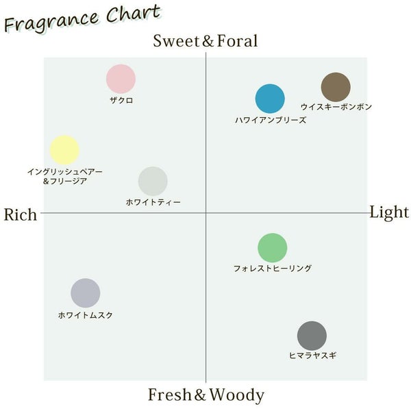 清潔感とやさしい甘さ、柔らかな温もりを感じさせる、万人に好まれる穏やかな香りです。