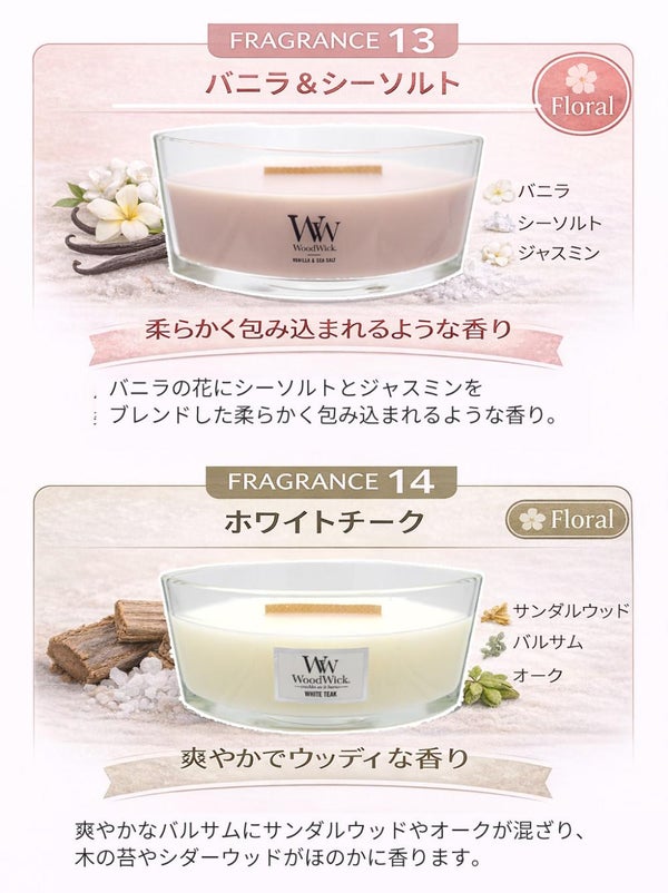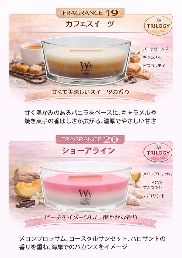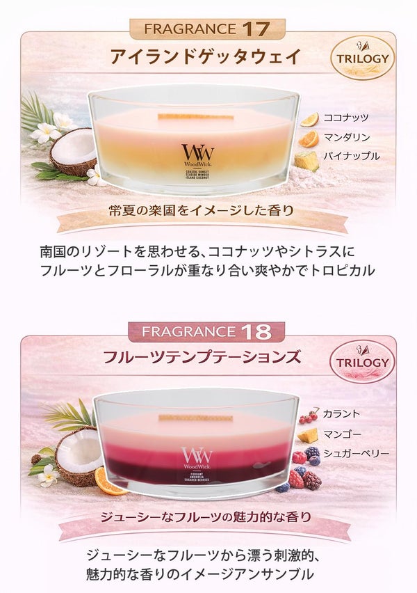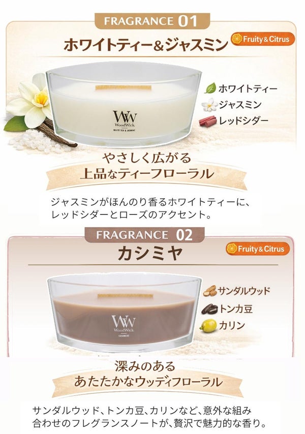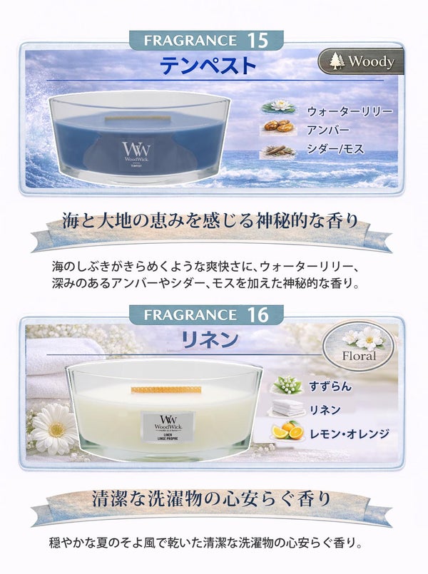 香り:ホワイトティー&ジャスミン/カシミヤ/マグノリアバーチ/セージウッド&シーグラス/ユズブルームズ/アメジスト&アンバー/ラベンダー&シダー/ウォームウール/レッドウッド/ラベンダースパ/コースタルサンセット/イブニングバンファイア/バニラ&シーソルト/ホワイトチーク/テンペスト/リネン/フルーツテンプテーションズ/アイランドゲッタウェイ/カフェスイーツ/ショーアライン/ウォームウッズ