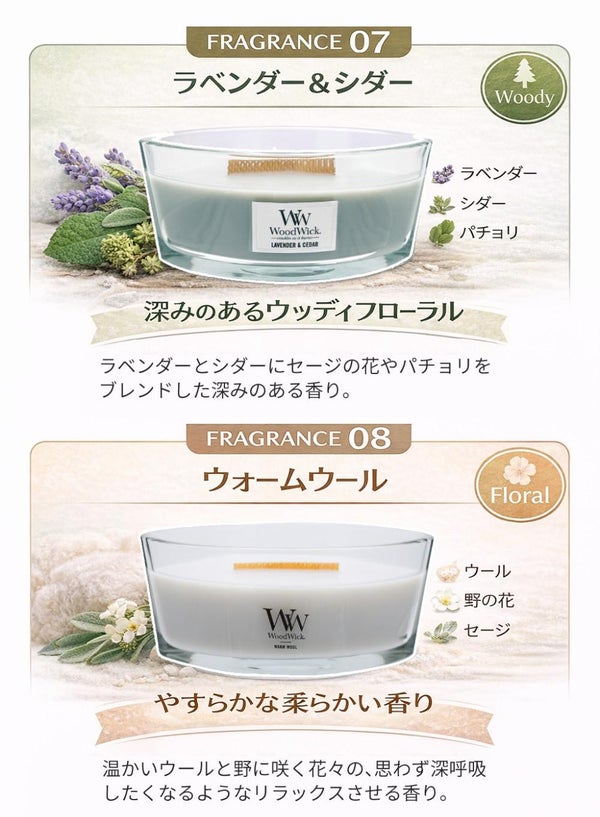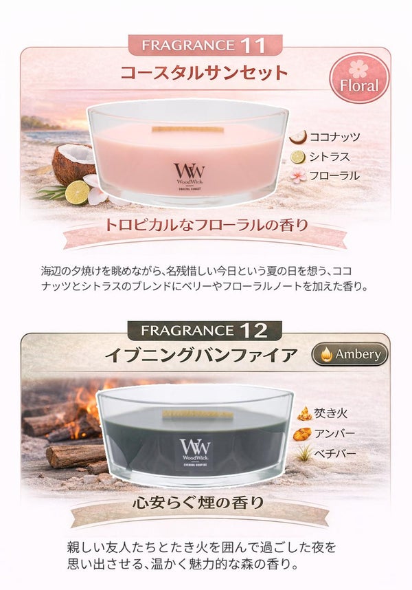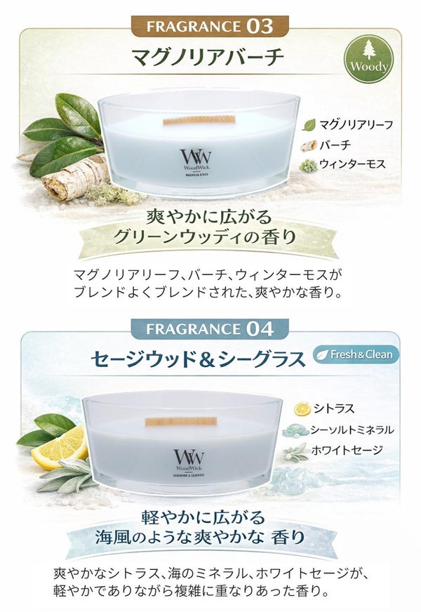 本ページは、WoodWick ハースウィックの香りを選べる商品ページです。お好みに合わせて香りを選択できるため、ウッドウィック ハースウィックをシリーズで探している場合にも選びやすい仕様です。