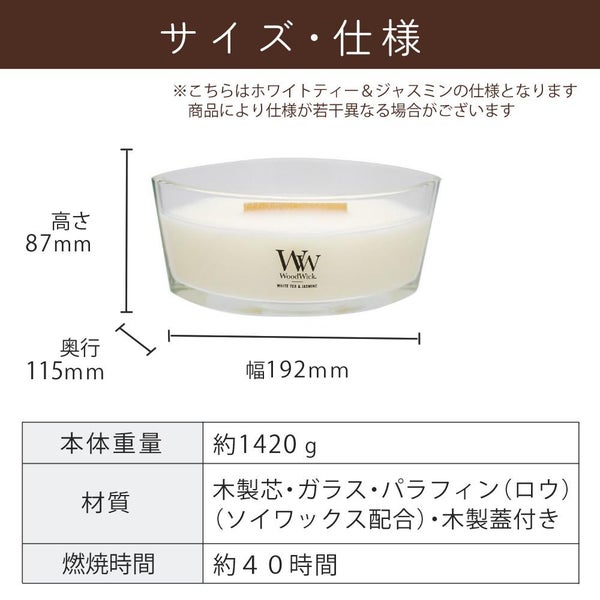 本体はガラス容器入りで、木製蓋が付属しています。全種類ブラックの箱付きタイプで、WoodWick ハースウィック共通仕様として統一されています。