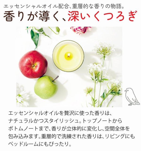 最先端のフレグランス製品の開発を続け、繊細な調香と エッセンシャルオイル を配合した高品質な ブレンドワックス 作られた キャンドル 。