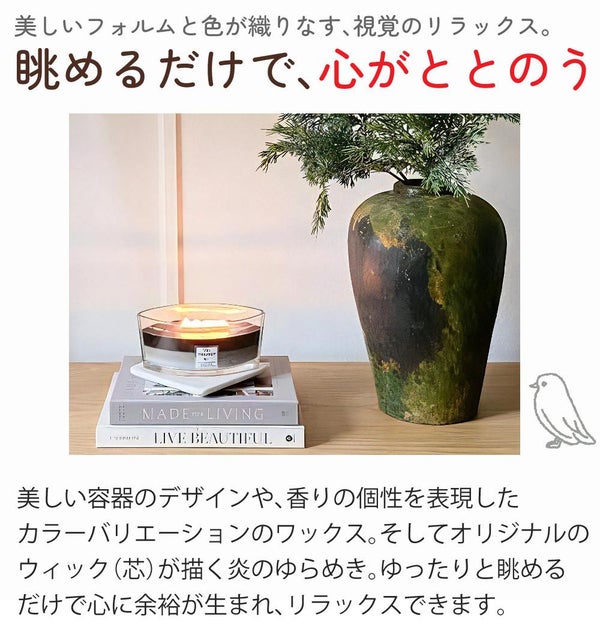 芯が自然木でできており、燃やすとたき火や暖炉のようにパチパチと音のするキャンドルです。ハース(Hearth)とは暖炉のこと。ウッドウィックから聞こえてくるパチパチ音はそのままに、暖炉でゆらめく炎の心地よさを再現しました。 「癒しの灯り」「高品質な香り」「パチパチ音」のハーモニーをより一層お楽しみいただけます。また、選び抜かれたカラーと香りは使う人を選びません。 自分使いにも、贈り物にもおすすめのキャンドルです。