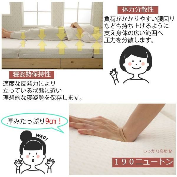 体圧分散性に優れ、体をバランスよく支えてくれます。 厚みもたっぷり9cmあるので底付き感なくお休みできます。