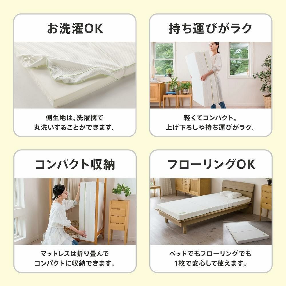 Flat ヘルシーマットレス は 高反発 ウレタンフォーム 採用 の 三つ折りタイプ 寝具 で、エアーホール が 通気性 を高め、寝返り を サポート しながら 正しい 寝姿勢 を整えます。コンパクト圧縮梱包 で届き、開封後72時間で 本来 の 厚み に 回復。側地 は 取り外し 洗濯可 により 清潔 さをキープ。シングル・セミダブル・ダブル展開、厚さ8cm で ベッドやフローリング に対応。西川 睡眠Labo の 睡眠科学 に基づく設計 に 3年保証 つき だから 安心 して 使えます。