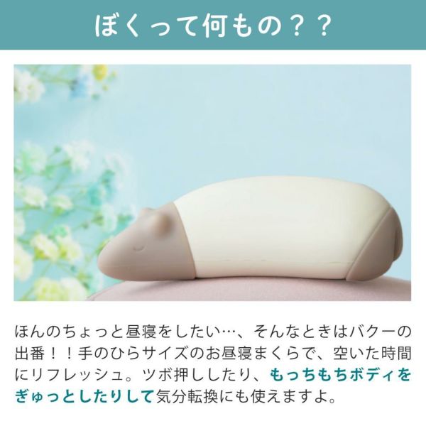 「デスクの可愛い相棒」をコンセプトに、ツボを押したり、握ったり、お昼寝の相棒にもなるデスクの上で活躍するバクー形のお昼寝枕「Baquu」(バクー)は開発されました。